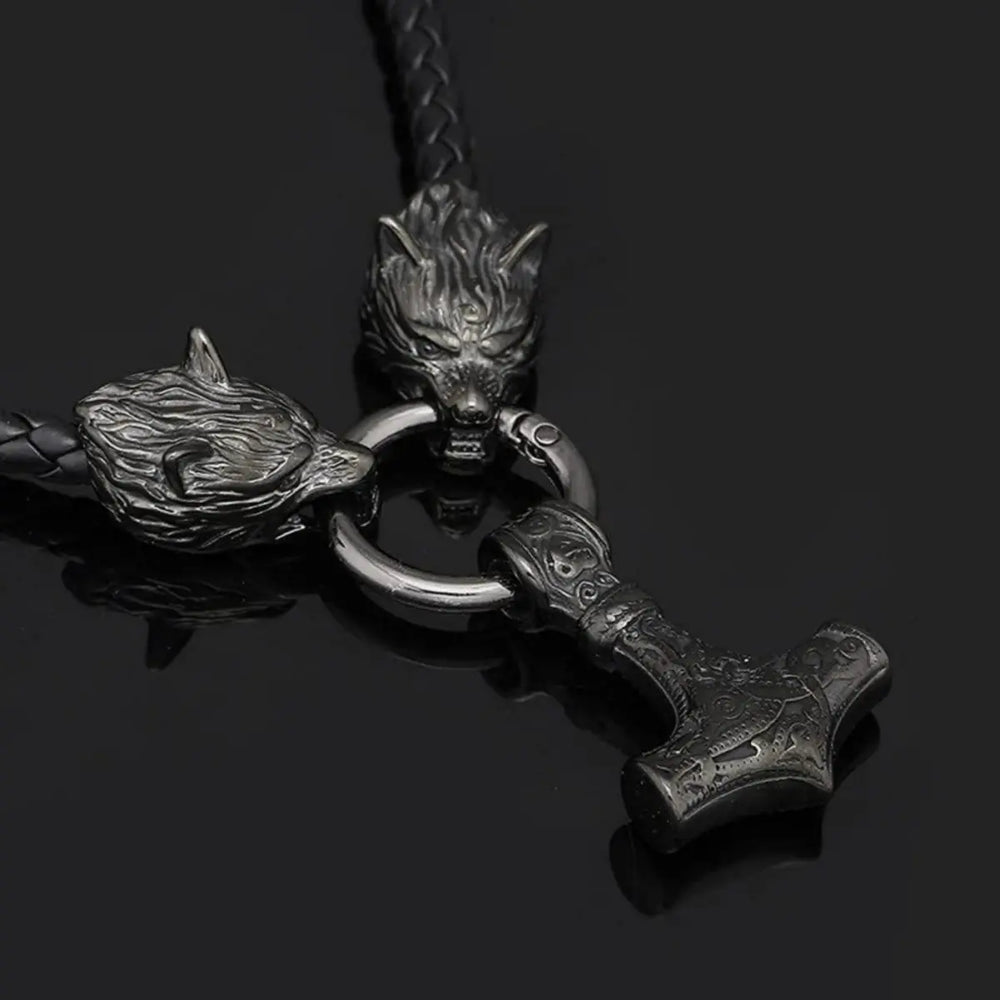 Vintage Viking Thor Hammer Pendant Wolf Head Leather Necklace