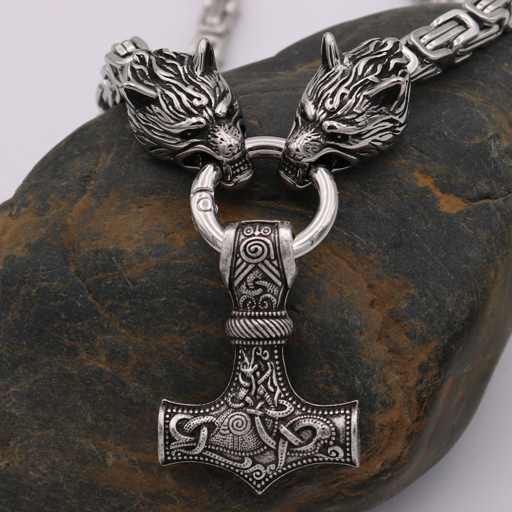 STAINLESS STEEL WOLF HEAD BYZANTINE CHAIN WITH MJOLNIR