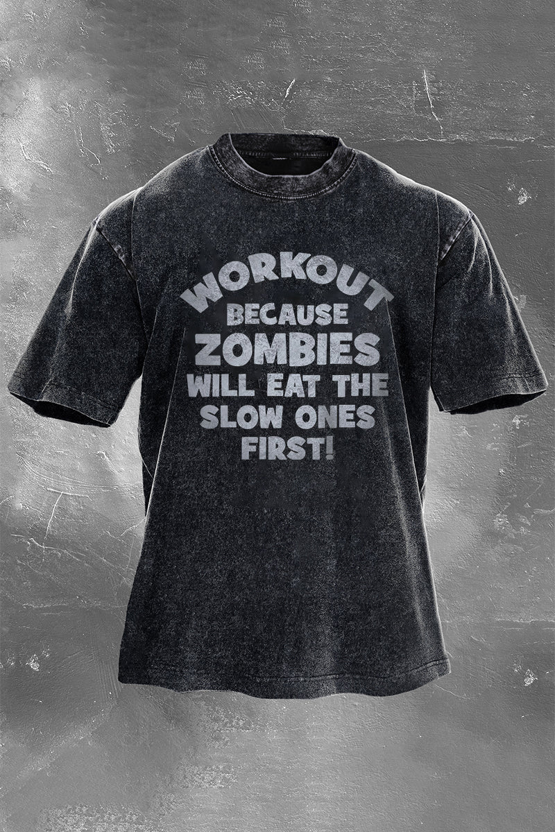 Workout Because Zombies Will Eat The Slow Ones First Printed Men's Washed T-Shirt