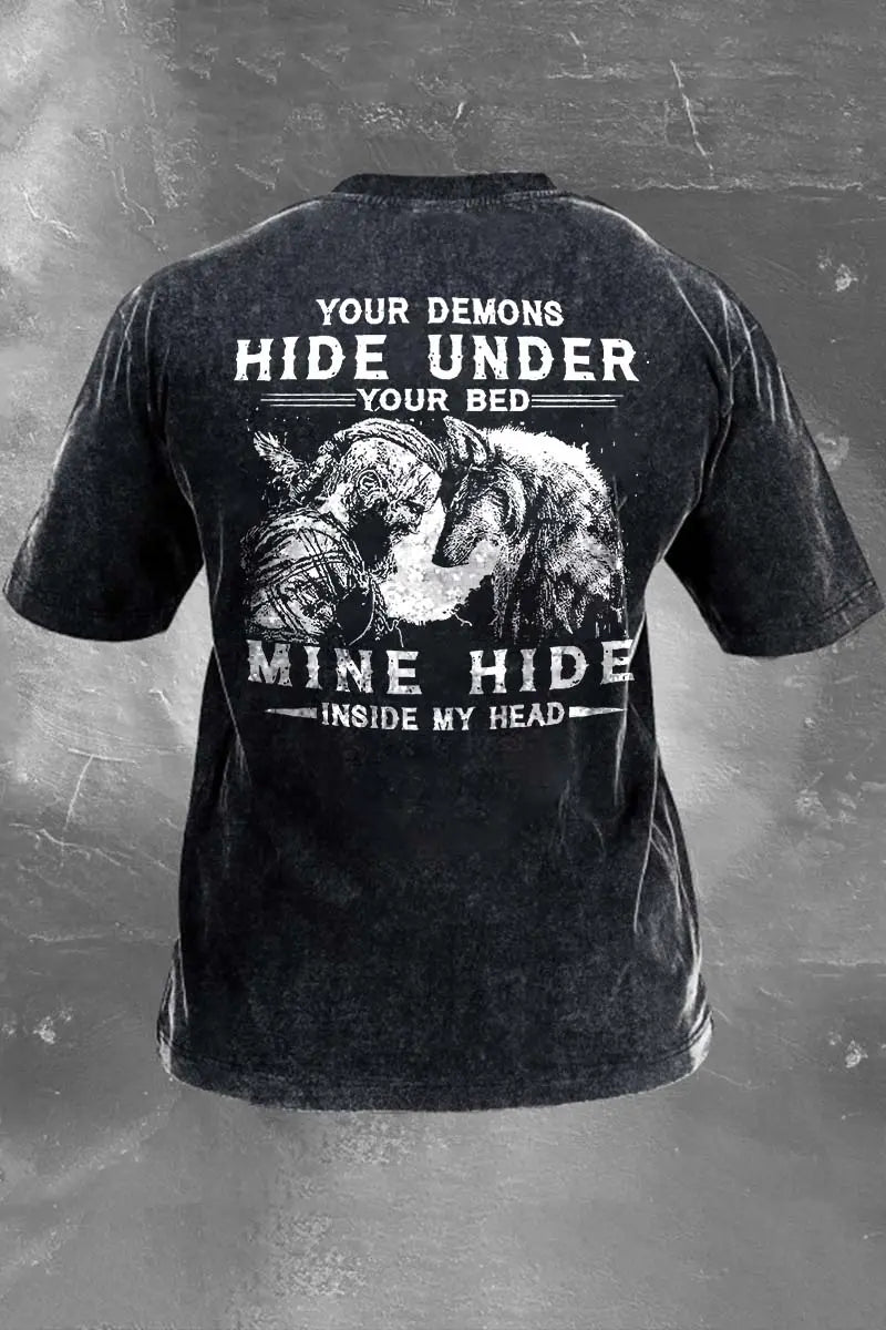 Viking Your Demons Hide Under You Bed Printed Men's Washed T-Shirt