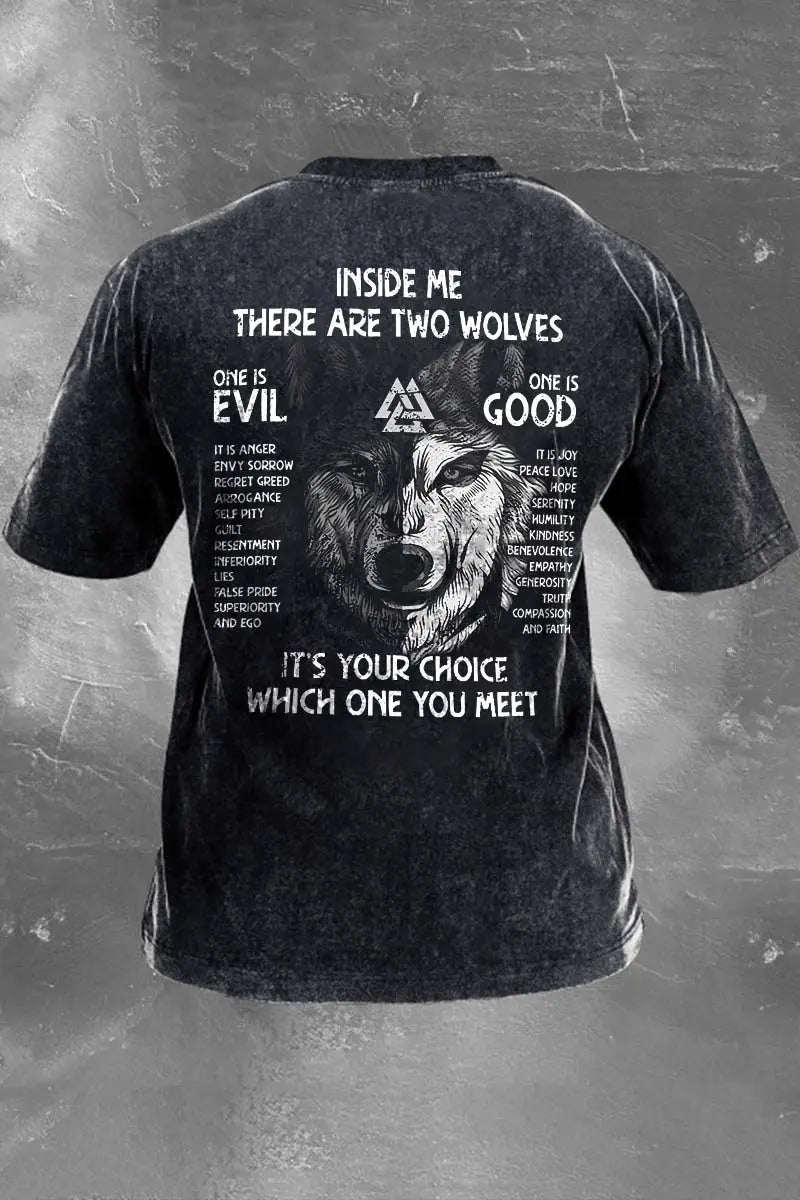 Viking Inside Me There Are Two Wolves Printed Men's Washed T-Shirt